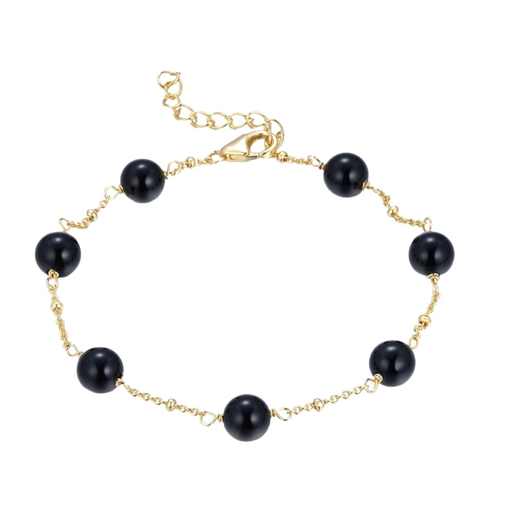 Tento stříbrný náramek 925 s černým onyxem vyniká kombinací přírodních polodrahokamů a elegantního zlatého tónu. Onyxové korálky o velikosti 6 mm jsou pečlivě zasazeny do jemného řetízku ze stříbra 925/1000, což zajišťuje dlouhou životnost a luxusní vzhled.