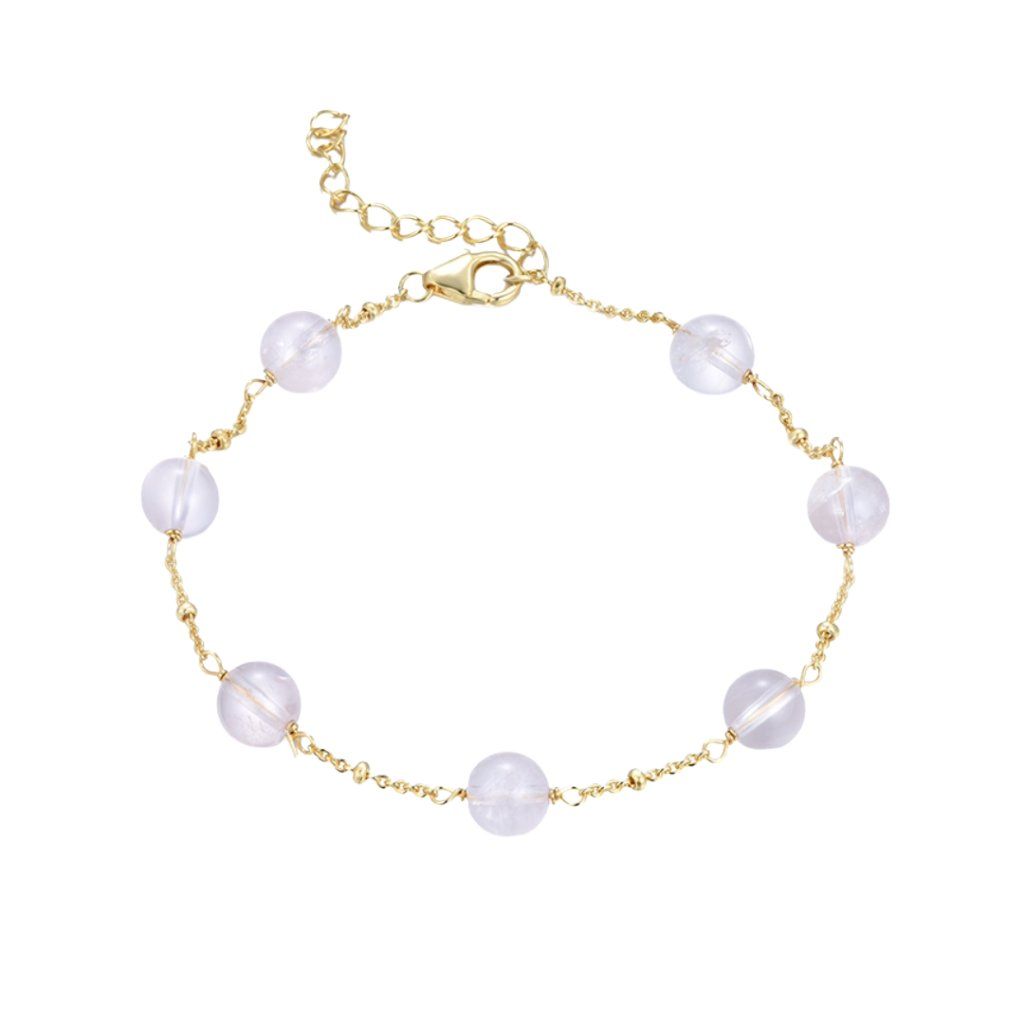 Pozlacený náramek Rose Quartz Harmony je elegantní a velmi ženský šperk, který v sobě spojuje minimalistický design a přirozenou krásu přírodního kamene. Dominantou náramku jsou jemné kuličky růženínu, které jsou rovnoměrně rozmístěny po celé délce řetízku.