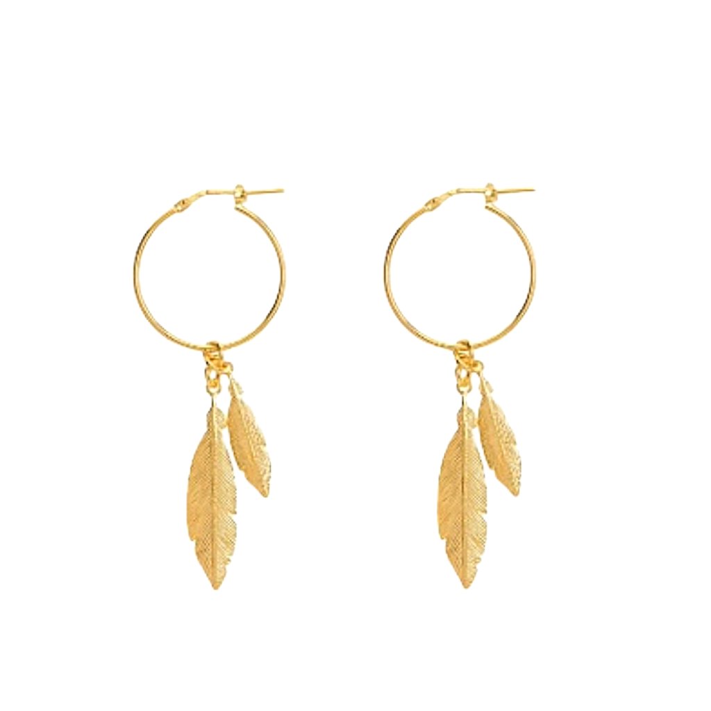 Tyto pozlacené kruhové náušnice s pírky kombinují klasický kruhový tvar s detailně zpracovanými přívěsky ve tvaru peří ✨