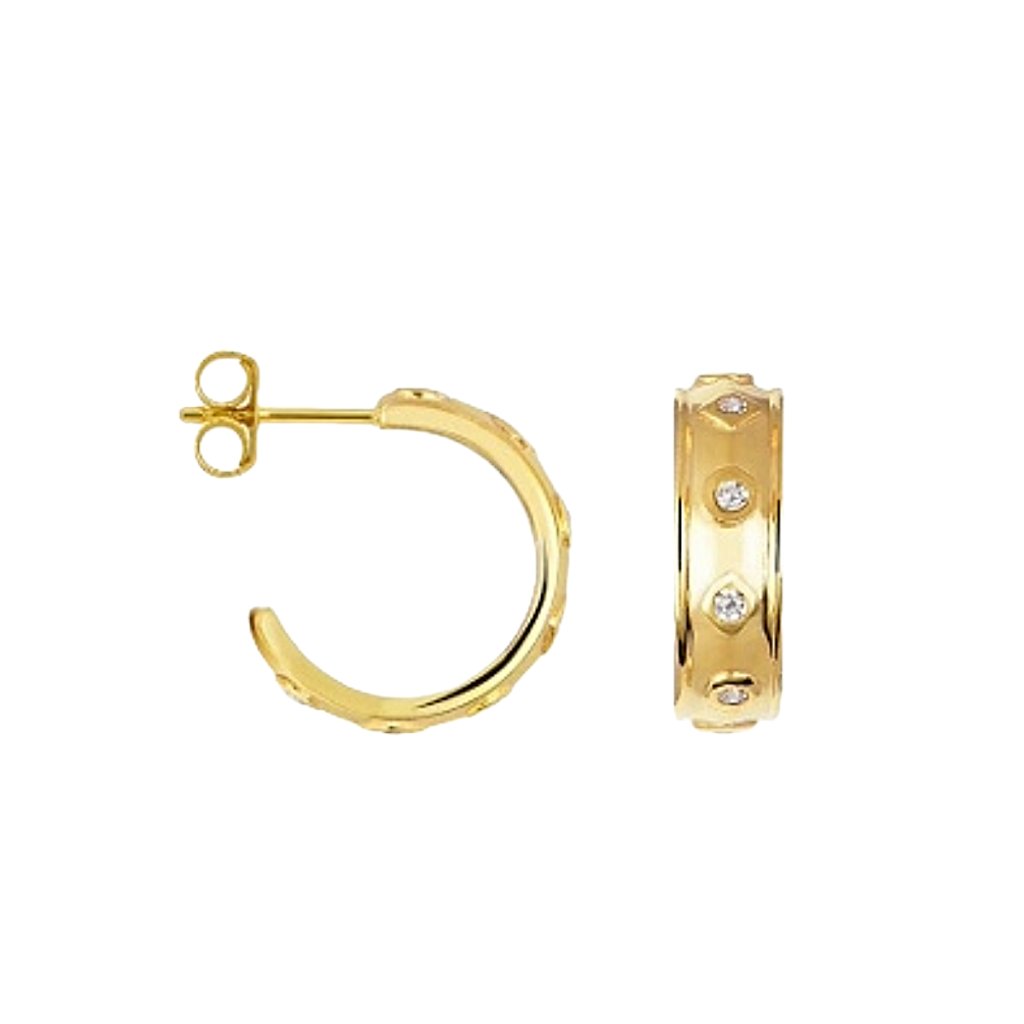 🤍✨ Elegantní pozlacené kruhové náušnice se zirkony jsou šperkem, který se stane nepostradatelnou součástí vaší šperkovnice ✨. Precizní osazení zirkonů dodává náušnicím jemný třpyt, zatímco kruhový tvar krásně rámuje obličej a působí vyváženě a ženským dojmem 💎.