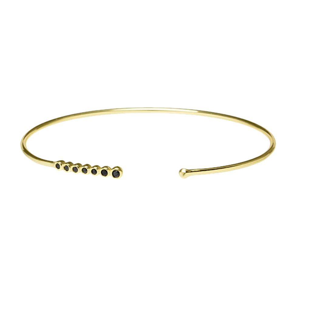 Pozlacený stříbrný náramek s černými kameny je ideální volbou pro milovnice jednoduché, ale výrazné elegance. Otevřený design zajišťuje pohodlné nošení a nadčasový vzhled, který se hodí ke každodenním outfitům i slavnostnějším příležitostem ✨🖤.