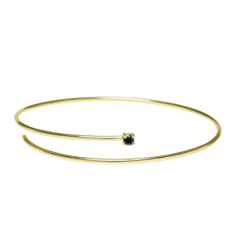 Pozlacený stříbrný náramek s černým kamenem je dokonalou volbou pro milovnice minimalistických šperků. Jemný otevřený design působí lehce a moderně, zatímco kontrast zlatého odstínu a tmavého kamene vytváří elegantní a sofistikovaný efekt 🖤✨.