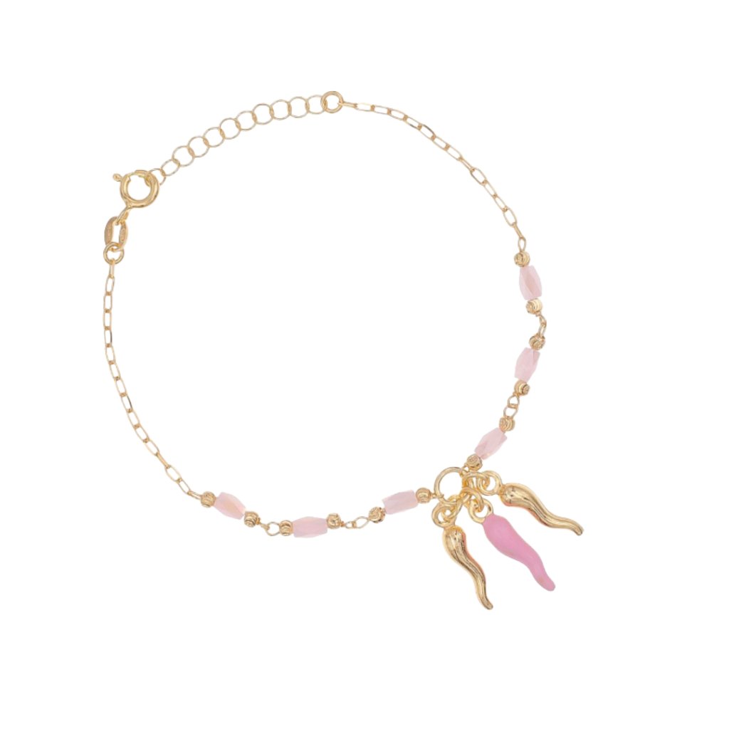 Tento pozlacený náramek s symbolem rohu hojnosti a růžovými korálky zaujme svou lehkostí i originálním designem ✨. Kombinace jemného řetízku, drobných kamenů v růžových tónech a výrazných přívěsků vytváří harmonický kontrast mezi elegancí a hravostí 💕.