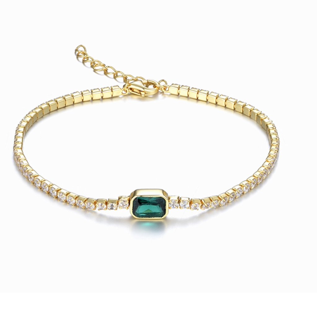 Pozlacený stříbrný náramek se zeleným kamenem představuje harmonické spojení klasické elegance a moderního designu 💎. Jemná linie čirých zirkonů krásně odráží světlo a zvýrazňuje centrální kámen, který přitahuje pohledy a dodává šperku luxusní charakter.