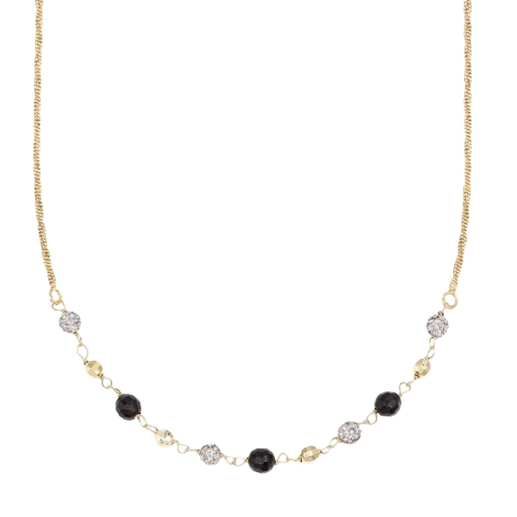 Dominantou náhrdelníku jsou drobné korálky, které jsou rozmístěny v přední části řetízku. Kombinace černých, zlatých a třpytivých korálků vytváří zajímavý kontrast a dodává šperku moderní charakter.