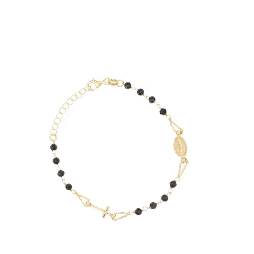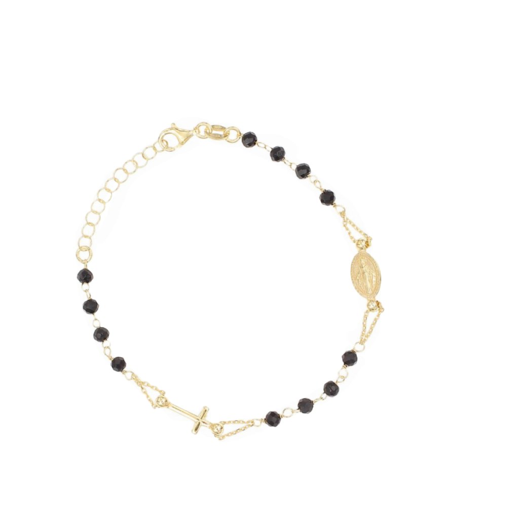 Pozlacený růžencový náramek 925 s černým onyxem je elegantní duchovní šperk, který kombinuje jemný řetízkový design s tradičními symboly víry. Precizní zpracování zajišťuje pohodlné nošení a dlouhou životnost šperku.
