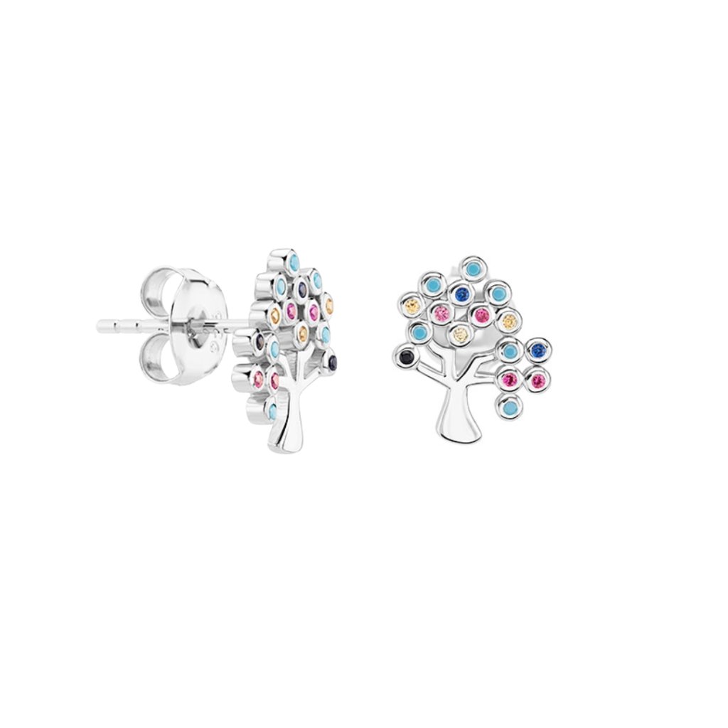 Design náušnic tvoří stylizovaný strom, jehož větve zdobí drobné barevné zirkony. Ty připomínají malé plody nebo květy a dodávají šperku jemný barevný třpyt. Kombinace různých odstínů kamínků vytváří veselý a zároveň elegantní efekt.