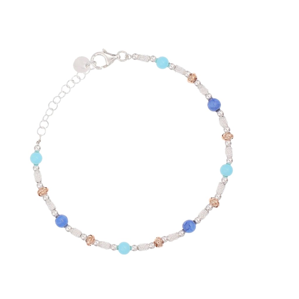Tento elegantní náramek zaujme kombinací stříbrného tónu a barevných korálků v modré a světle tyrkysové barvě ✨