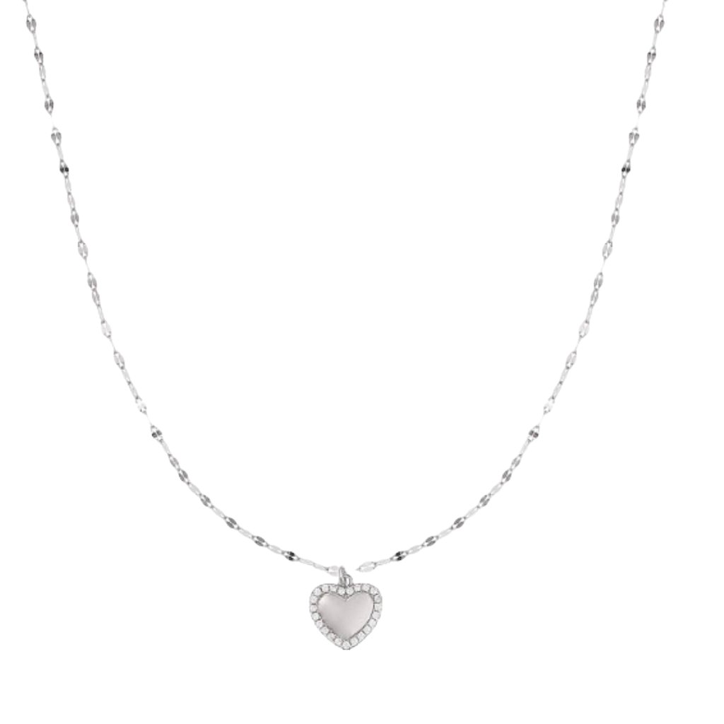 Tyto kamínky krásně odrážejí světlo a dodávají šperku jemný luxusní třpyt. Hladký střed srdce vytváří elegantní kontrast s třpytivým okrajem a zvýrazňuje romantický charakter náhrdelníku.
